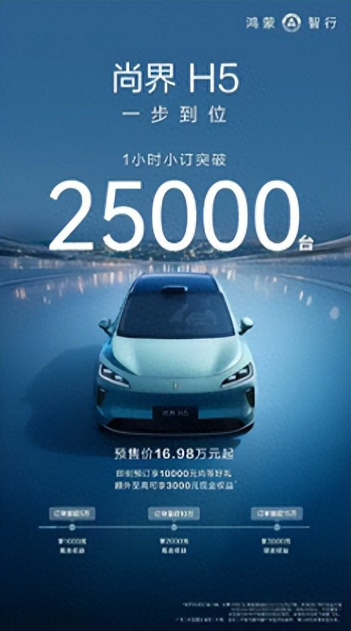 真是应了那句话,能打的一个都没有。问界把M5推出来的时候,还只是小范围试探市场,但这次尚界H5一亮相,直接点燃了发布会全场。根据官方发布出来的数据,短短一个小时尚界H5的预售订单就突破25000台,这种火爆程度,放在整个新能源汽车市场都是极少见的。